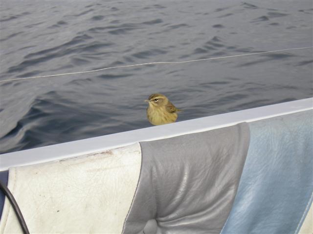 5 Oct Finally a break in the wind as my guest Frank Lorsbach and I headed out in heavy overcast but light winds. We set lines at 118' and fished briefly as deep as 180', but didn't follow the bottom. Most of our action was between 120' and 140'. Frank decided 114' clicks on the downrigger was about right and darned if he didn't get a nice 6# Laker. I think he caught 3 Lakers running that setting so it warranted a little teasing by asking him how deep I should be running on my rigger. The Johnson rod came through for the last fish. Most of the Lakers were in the 3# range. The surface line once again did absolutely nothing. We did have a couple of sparrows visit us and sit on the back of the boat, then one went up on the dashboard for a while. I was actually able to touch one, hoping it'd jump unto my finger but he liked sitting on the downrigger more. They finally flew off after about 10 minutes of rest. Click on picture to enlarge, back button to return here.