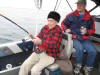 8 Oct And today was nicer than our last trip. In light winds and seas, Frank, his nephew Charles Franklin, and I headed out to our fishing grounds where we were quite successful last time. The fall colors were beautiful in the sun and the temperature was nearly 70º, perfect. We set lines at 120' and it wasn't long before the Johnson rod was bouncing. Charles reeled that one in and before long, another rigger rang and we boxed another Laker. Our plan was to box 4 then start tagging and releasing. Well, the next rigger hit was a single line double, two Lakers on one line, which Charles handled too. We ranged in depth between 120' and 160', probably doing best at 140'. We ended up keeping 6 Lakers and tagging 8 and not missing any (that's unusual), all in 3 1/2 hours. Here're some pictures of Charles at work. Click to enlarge.
