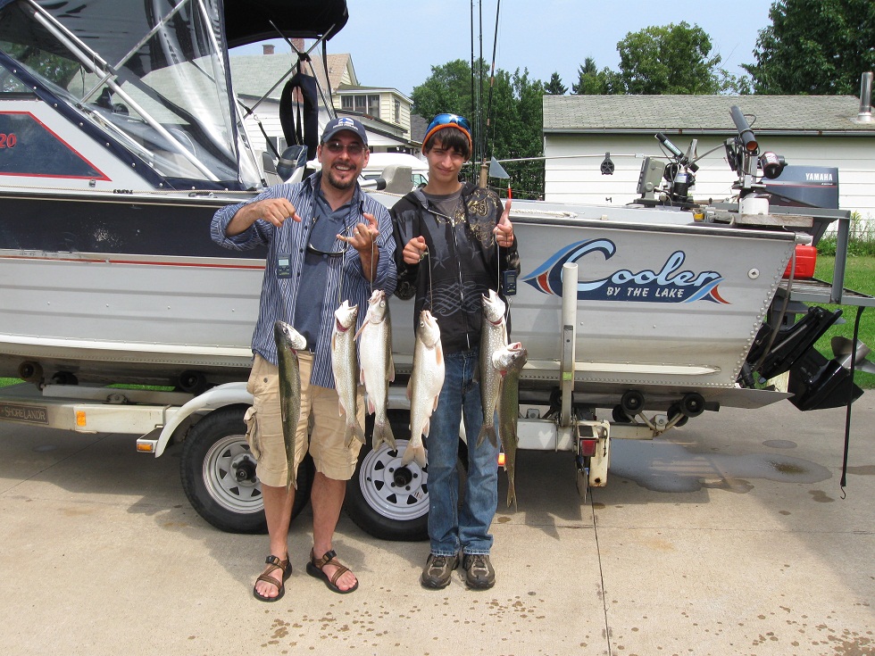 7 Aug The forecast was for winds from the south around 5 mph. The reality was 18 mph with 2-3' seas as my guest Ron and Alex Rabe joined me. We thought we'd fish a little while with the waves and wind, putting out the Johnson rod and only one rigger. Not 5 minutes passed before the Johnson rod bent over. Ron wrestled with that Laker until we could finally net it. We quickly tagged and released it but without weighing it first. I estimated it to be around 12#. While the Johnson rod was in, we pulled the rigger and punched through some big waves on the way in. Of course Ron thought the Laker weighed more and was telling people at the dock that. So today was probably the shortest trip of the season, being a quarter of an hour and producing the biggest fish so far this year.