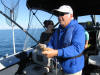 1 July This morning my guests were Paul and Bobby Geraghty, visiting from Ireland. We set lines at 150' and worked as deep as 215' but action was very slow, going the first hour without a mark or hit. It picked up and we were getting a Laker her and there. Paul did reel in a single-line double, two Lakers on one line. We were just wrapping it up having tagged and released 8 Lakers when the final Laker was caught, having a green tag in it, but it wasn't one of mine. The seas were fairly well behaved with a steady 10mph wind from the north and about 1' seas. Both the water and air temperature were steady at 55º so the bright sun helped keep us comfortable.