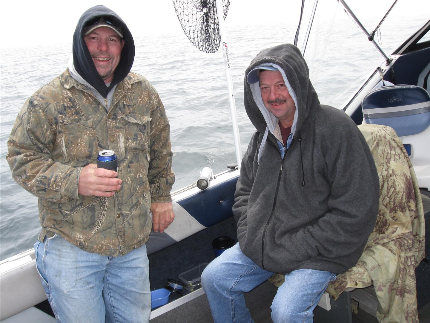 18 June Today might be best described as a "double hoodie day". My guests today were Tom Foster and Guy Cooksey from Illinois, both of whom have fished with me over quite a few years. It didn't look that foggy when we left but that changed en-route. Not forecast either so it was nice to have the radar to spin up. Conditions were otherwise decent, even with a NW wind aroound 9mph and seas with 1-2 rollers, I was totally surprised there weren't whitecaps, given the long fetch. Who knws eh? We set lines at 170' and generally stayed in the 200' range where we slowly picked up 5 Lakers, and missed one. The fog didn't lift until the end of our nearly 3-hour run and as we approached the ramp. We were the only boat to launch and return at the ramp. Great excursion, with a little BS nostalgia thrown in. BTW, the air droped a little to 41º and with a slow breeze, hence the double hoodie by Tom. Here's a picture. Click to enlarge, use your back button to return here.